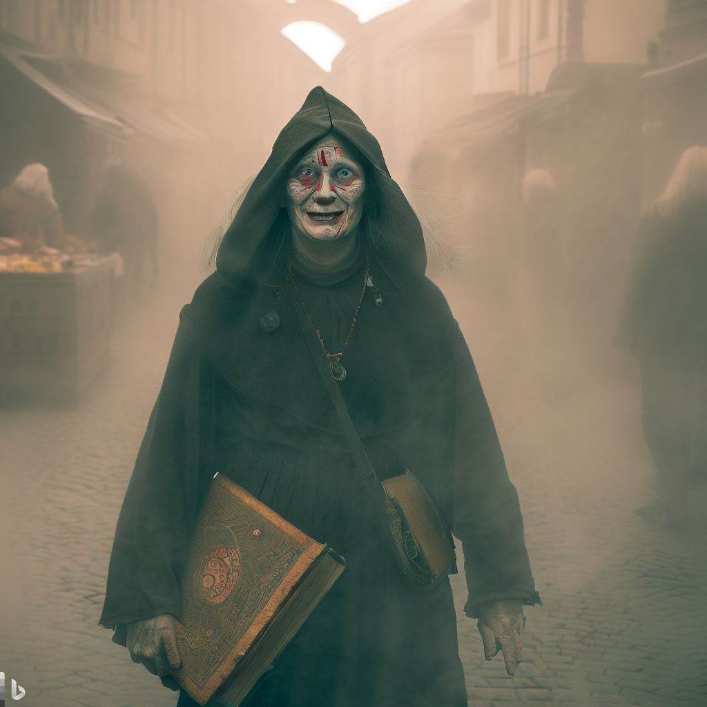 As Amelia set up her stall, she noticed the townspeople were behaving oddly. Their usual friendly banter was replaced with hushed whispers, and they cast nervous glances at one another as they hurried about their business. Soon, Amelia discovered the cause of their unease: a mysterious, old woman had appeared in the market, seemingly out of nowhere. This enigmatic figure was peddling an array of peculiar items, including a dusty, antique book filled with cryptic symbols and ominous incantations.