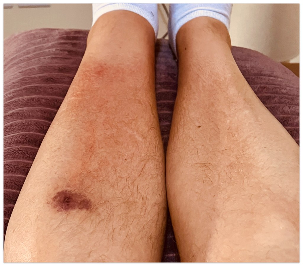 As the day wore on, Hugo’s ‘little nip’ began to unfurl its true colors. His shin took on an alarming hue of violet-red, his lower leg swelled up like a well-risen loaf of bread, and it was hot to the touch. The initial sting had now escalated into a punishing pain that made every step a torment.
